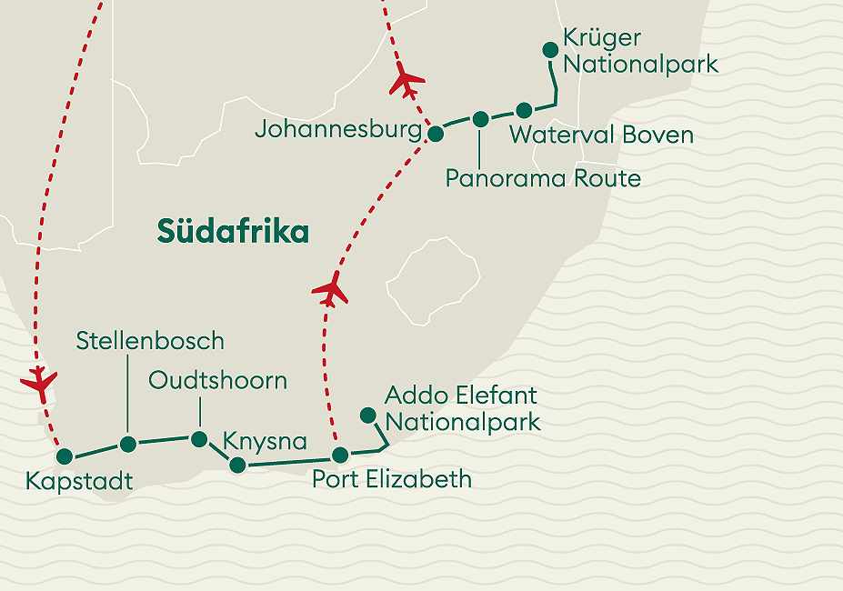 Direktflug mit Edelweiss ab Zürich nach Kapstadt. Rückflug mit SWISS ab Johannesburg nach Zürich.