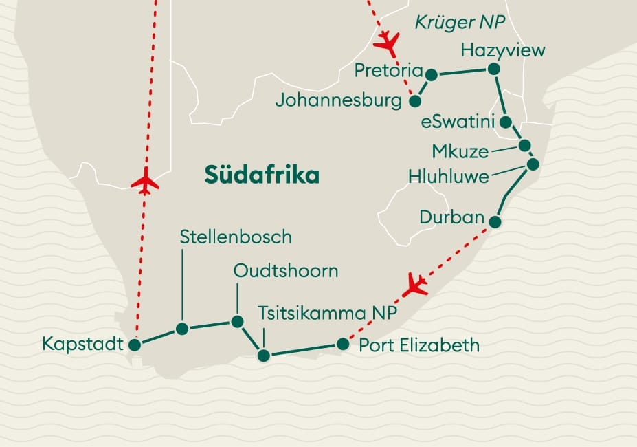Direktflug mit SWISS ab Zürich nach Johannesburg. Rückflug mit Edelweiss ab Kapstadt nach Zürich.