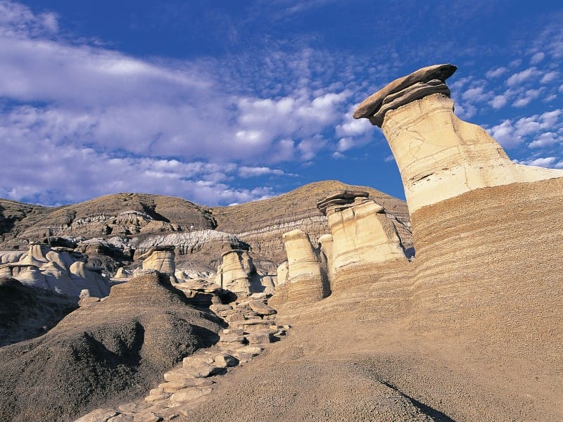 Den ersten Stopp des Tages legen Sie am Hoodos-Trail ein. Hier können Sie bereits in die einzigartige Landschaft rund um Drumheller eintauchen. Hoodos sind Sandsteinsäulen, die über Millionen von Jahren entstehen und bis zu 7 Meter hoch werden können.