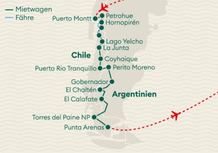 Während Ihrer Reise von Puerto Montt nach Punta Arenas erleben Sie eine Vielzahl von klimatischen Bedingungen, die sich je nach geografischer Lage und Höhenlage stark unterscheiden. Beginnend in Puerto Montt mit seinem gemäßigten Klima, das durch durchschnittliche Temperaturen von 11-17°C und häufige Niederschläge geprägt ist, führt die Route weiter südlich nach El Calafate. Hier herrscht ein kaltes Wüstenklima mit durchschnittlichen Temperaturen von 5-13°C, begleitet von starkem Wind und Sonnenschein.