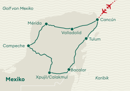Entdecken Sie Yucatán auf dieser 7-tägigen Mietwagenreise! Starten Sie in Cancún, besuchen Sie die Lagunen von Rio Lagartos und die Ruinen von Chichén Itzá. Erkunden Sie Mérida und Campeche, bevor Sie die beeindruckenden Stätten von Calakmul und Tulum erleben. Entspannen Sie schliesslich in einem Strandhotel Ihrer Wahl.