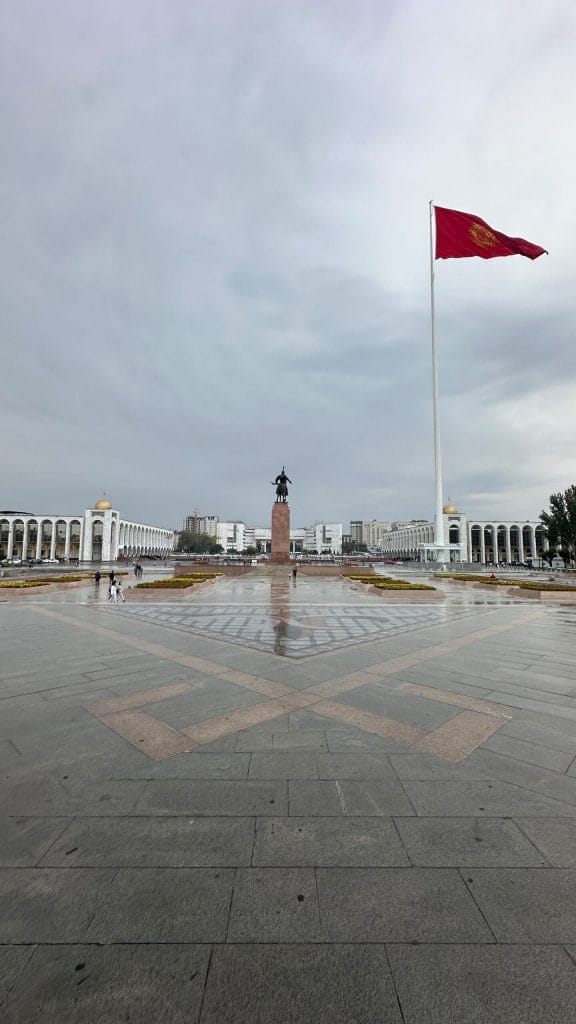 Bis 1925 lebte ein Grossteil des Volkes nomadisch und zog mit dem Vieh von Weide zu Weide. Als Teil der Sowjetunion wurde aber die Schulpflicht und damit die Sesshaftigkeit eingeführt. Heute leben im Land nur noch Halbnomaden – im Sommer flüchten sie mit ihren Tieren vor der Hitze in die Berge. Manchmal schlafen sie noch in der Jurte. Fast 80 Prozent der Bevölkerung arbeiten in der Landwirtschaft bzw. in der Viehwirtschaft oder im Gemüseanbau. Industrie gibt es nur wenig. Mit der neuen Seidenstrasse Chinas soll sich das aber ändern. Rund um den Yssykköl-See schlängelt sich eine kilometerlange Baustelle – das soll bald eine vierspurige Autobahn werden. Momentan treiben aber noch Bauern ihre Schafe per Pferd über die Schotterstrasse auf die Weide in der Nähe des Dorfes Tamchy. Zäune sucht man vergebens. Pferde, Schafe und Vieh grasen meist frei in der Herde. Was in der Landschaft aber auffällt, sind eckige Hügel und Ansammlungen von Steinen verschiedener Grössen, teilweise in Kreisen angeordnet. Der zentralasiatische Staat wurde von unterschiedlichen Kulturen und Völkern geprägt – die Hunnen und Karachaniden hinterliessen ihre Spuren in Form von Gräbern und Grabsteinen, auch Balbas genannt. Die Karachaniden waren Tausend nach Christus das erste Volk, das sich hier niederliess und erste Siedlungen baute. Sie brachten den Islam in das Gebiet. Davon zeugt auch eines der ältesten Minarette Zentralasiens, der Burana-Turm in der Region Tokmok. Die historischen Einflüsse spiegeln sich auch in der Hauptstadt Bishkek wider. In ihrem Herzen liegt der Platz Ala-Too, ehemals Leninplatz. Ala-Too heisst übersetzt «farbige Berge» – der Stolz des Landes. Der Platz ist eingerahmt von würfelförmigen sowjetischen Bauten, darunter auch das historische Museum. Mitten auf dem Platz thront der Flaggenstock, zur 100-jährigen Feier der kirgisischen Sozialistischen Sowjetrepublik dieses Jahr ganze 100 Meter hoch. Daran flattert die kirgisische Flagge: Roter Grund, der die roten Mohnfelder symbolisiert, und darauf eine gelbe Sonne mit vierzig Zacken. Jeder Zacken steht für einen kirgisischen Stamm. In der Mitte der Sonne ist ein Tündük abgebildet. Es ist das zentrale Element des Daches einer Jurte, welches das Ganze zusammenhält. Weiter vorne auf dem Platz, wo einst die Leninstatue positioniert war, steht jetzt ein Denkmal für das Epos «Manas».