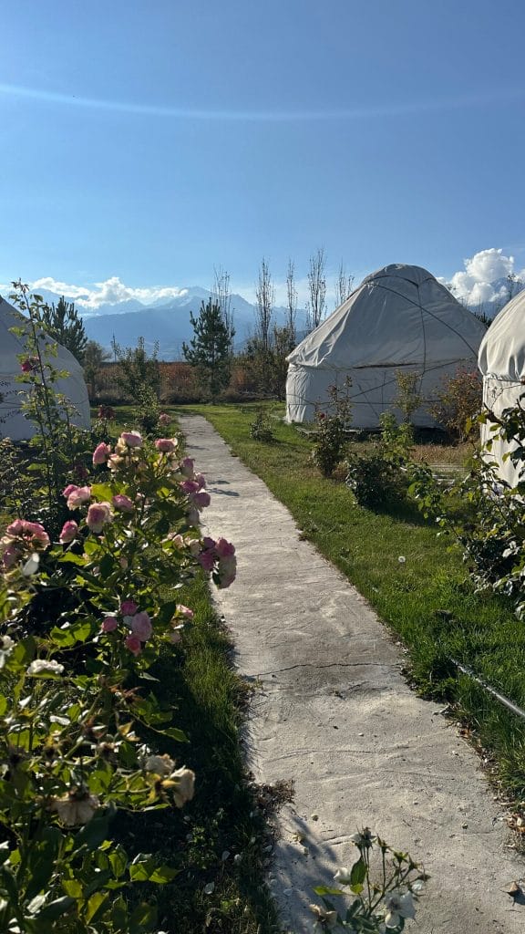 Als Gott die Welt schuf und das Land an die Völker verteilte, kamen die Kirgisen zu spät. Doch er hatte Erbarmen und gab ihnen einen Teil seines Paradieses ab. So zumindest die etwas selbstironische Legende. Doch bei der Fahrt auf 1600 Meter über Meer rund um den zweitgrössten Bergsee der Welt, dem Yssykköl-See, wird klar, dass das nicht von ungefähr kommt: Das Wasser funkelt in der Sonne, dahinter wechselnde Berglandschaften. Liebliche Lehmberge, rote Sandsteinfelsen und weisse Schneeberge. Der Yssykköl-See ist eingekesselt zwischen zwei Bergketten – nördlich der Kungej-Alatau und südlich der Terskej-Alatau mit Bergspitzen, die viereinhalbtausend Meter in die Höhe ragen.
