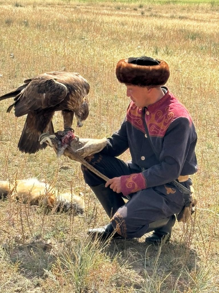 Ich möchte den Touristen unsere Tradition und auch unsere Kultur vermitteln. Die Adler sind unsere Freunde und jagen für uns, sie sollen aber nie ausgenutzt werden. So habe ich Karakös vor drei Jahren gerettet. Sie wurde in Tscholponata als Touristenattraktion missbraucht. Als ich sie fand, hatte sie zu lange Krallen und Verletzungen an Flügeln und auch