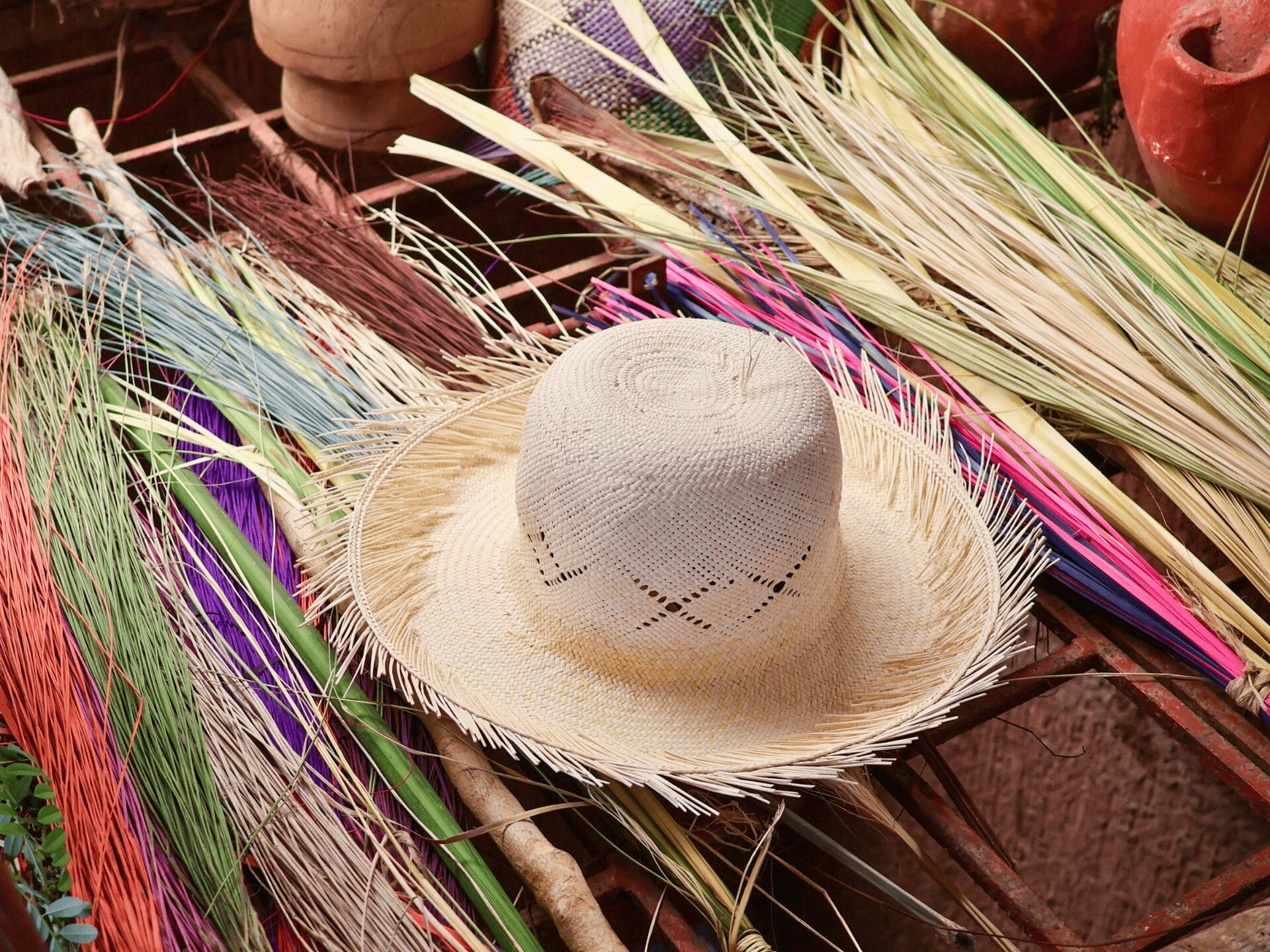 Rohmaterial für all diese Kunstwerke sind die Blätter der Jipi-Japa-Palme, welche Mitte des 19. Jahrhunderts in Mexiko eingeführt wurde. Seither werden die beliebten Panama Hüte nicht nur in ihrem Ursprungsland Ecuador geflochten, sondern auch in Yucatán (Mexiko). Nach der Ernte werden die gewaschenen und getrockneten Palmblätter erst mal in Streifen unterschiedlicher Breite aufgefächert, in einem Schwefelbad gebleicht und danach, meist mit Naturfarben, gefärbt. Je dünner die Faser, desto höher die Qualität des Endproduktes. Mit grossem Wissen zeigt uns Erminio, Doña Charis Mann, die unterschiedlichen Qualitäten der Blätter und womit sie gefärbt werden.